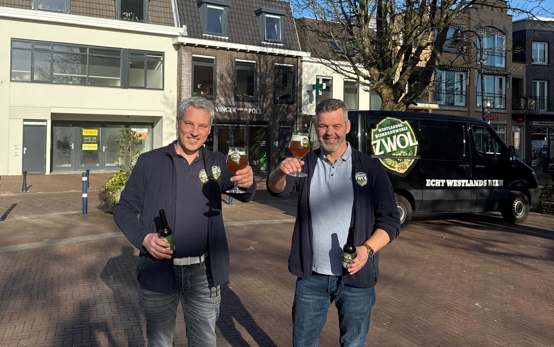Marty Olsthoorn (links) en Ad Zwinkels (rechts), de grondleggers van Westlandse Bierbrouwerij ZWOL, op het Kerkplein dat gebruikt zal worden voor het terras.